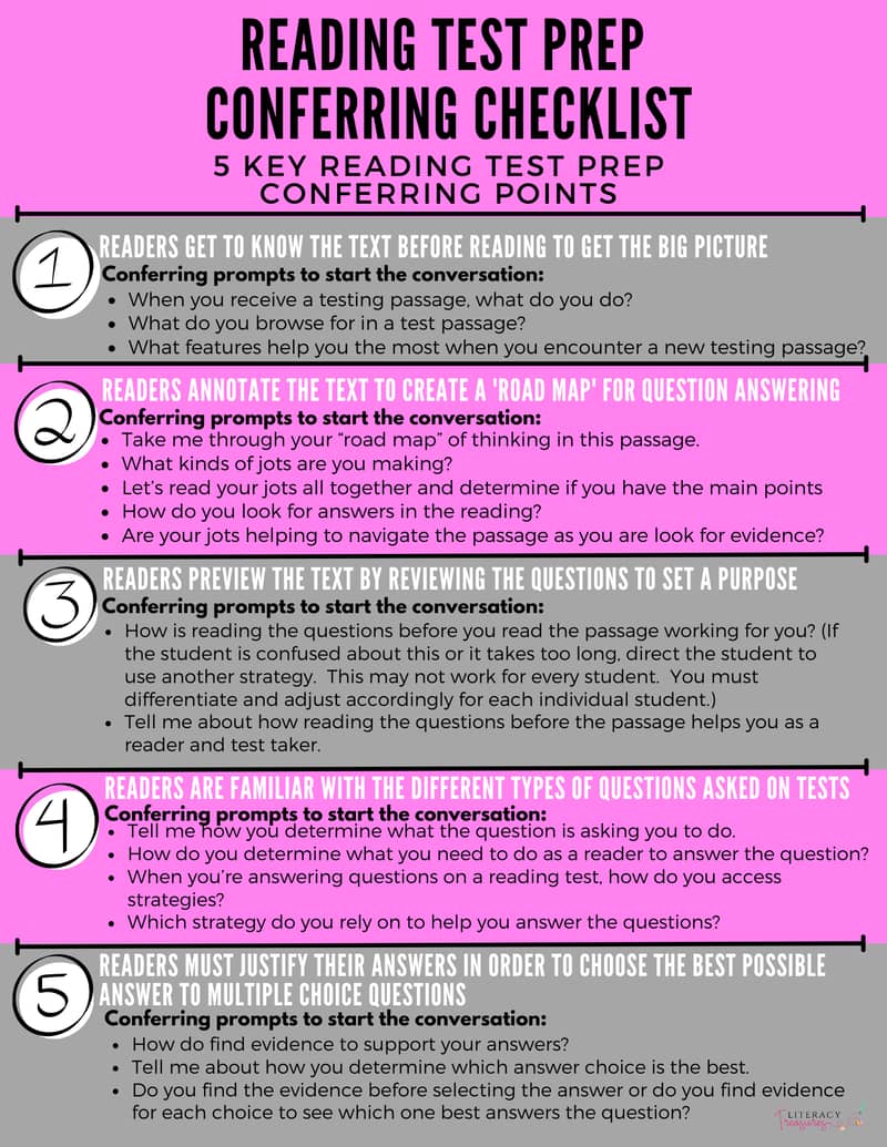 There are 5 conferring points that are aligned with the 5 key teaching points for a Reading Test Prep Unit of Study.